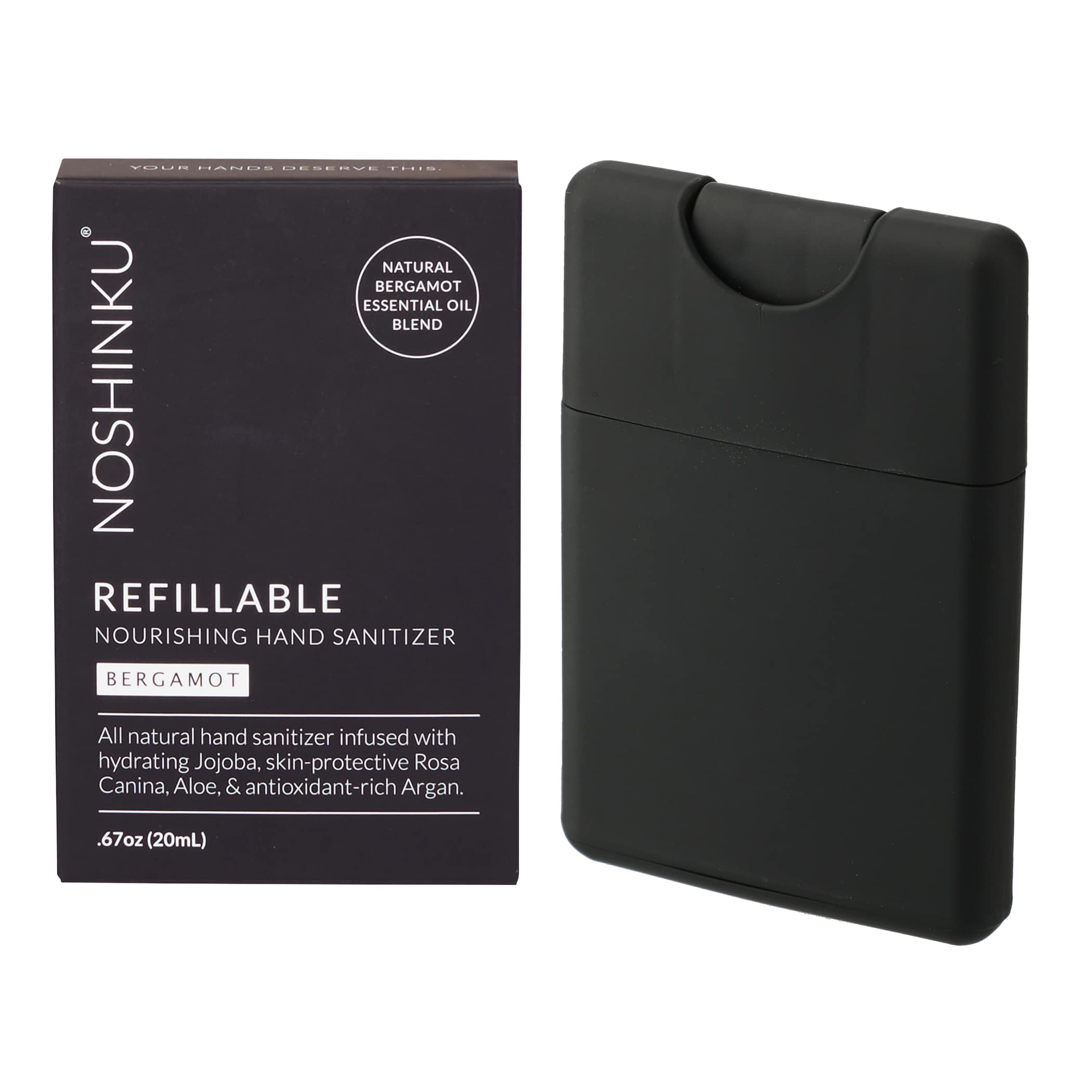 The 0.67oz Noshinku Refillable Pocket Hand Sanitizer features a hydrating and nourishing sanitizer blended with 70% pharma-grade ethyl alcohol distilled from organic cane sugar alongside a conditioning blend of Aloe, Rosa Canina, Jojoba and Argan to soothe, moisturize and protect skin. Noshinku sanitizer is an FDA-Registered and Compliant Formula. Each sprayer contains approximately 270 sprays and can be refilled. Made in the USA. Scents: BK (Bergamot), BL (Vetiver), GR (Eucalyptus), LV (Lavender) and YW (Lemon). 0.50″ D x 2.25″ W x 3.75″ H