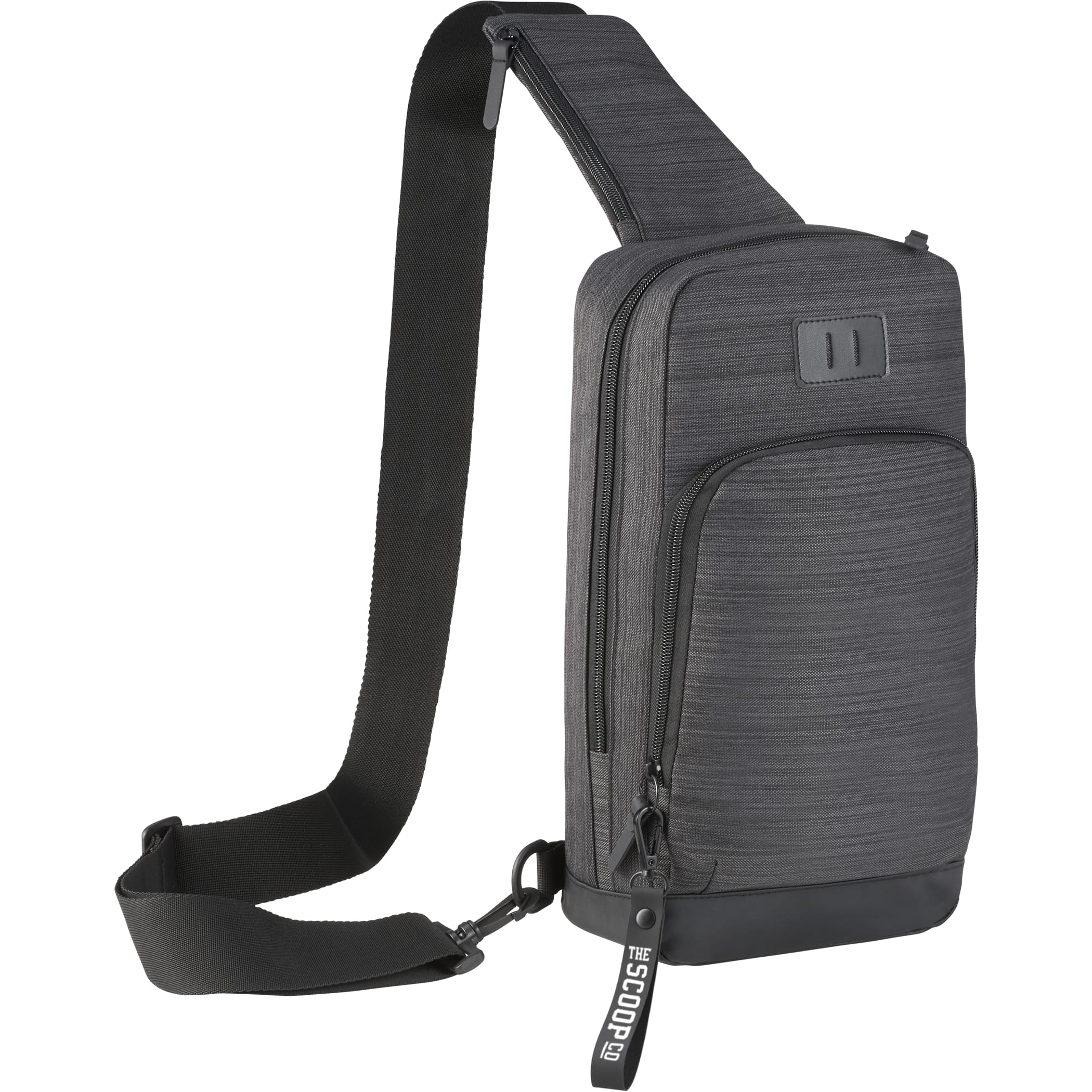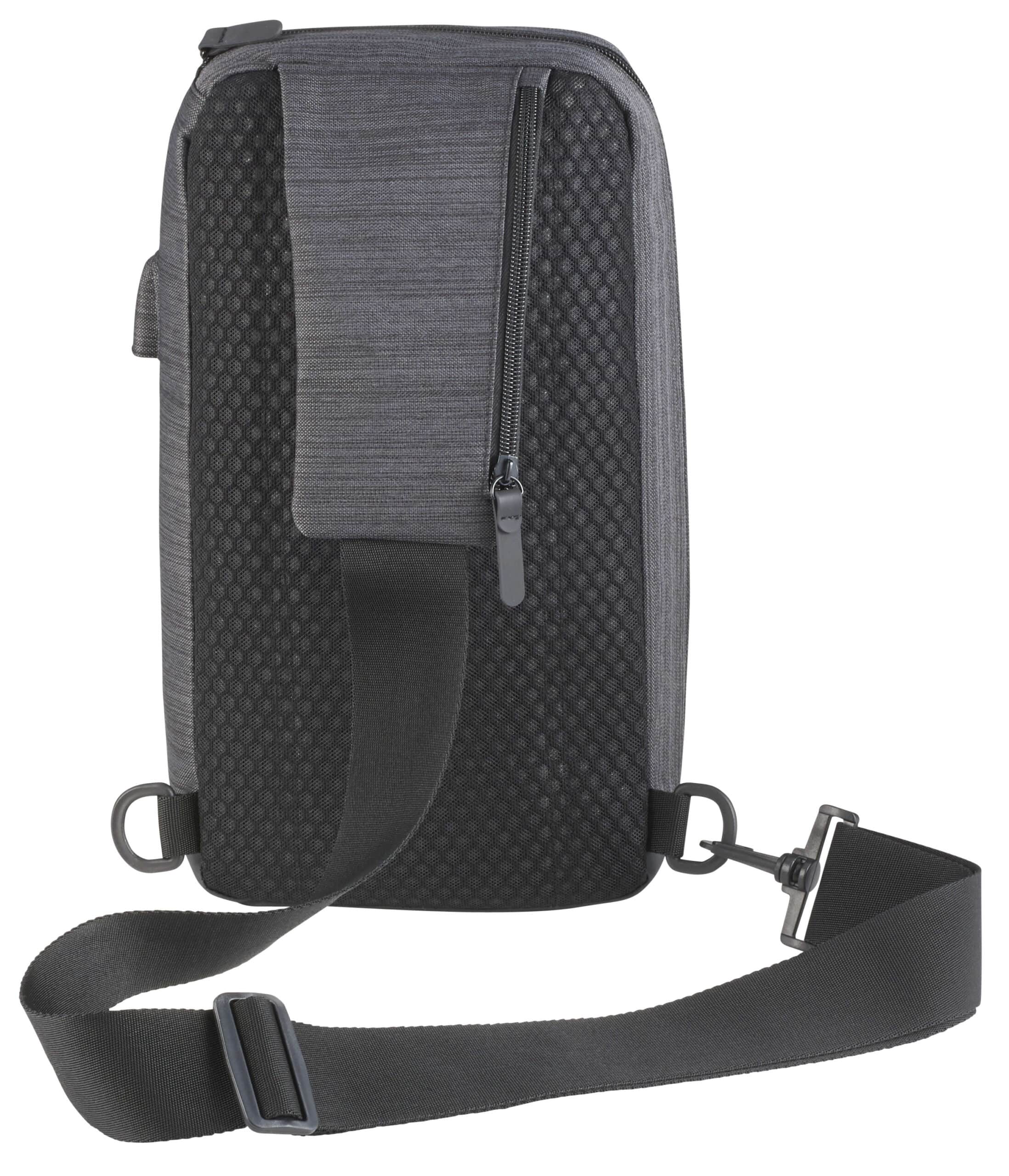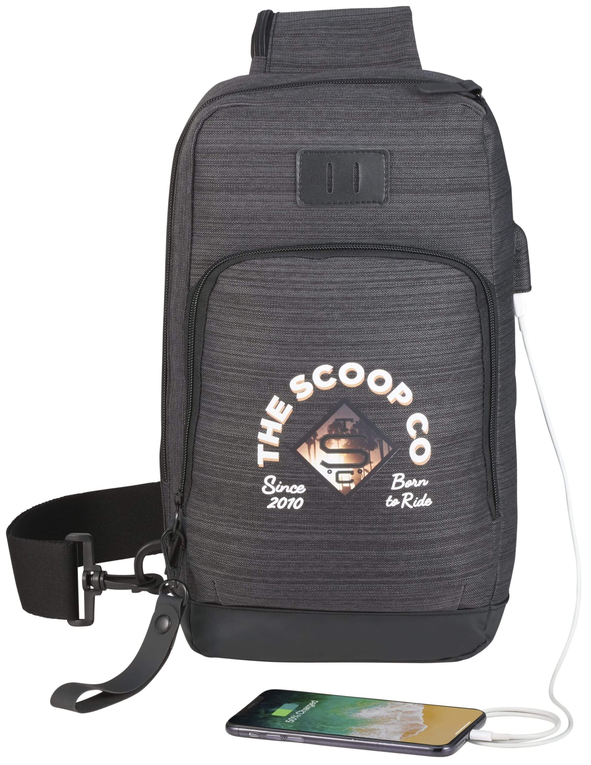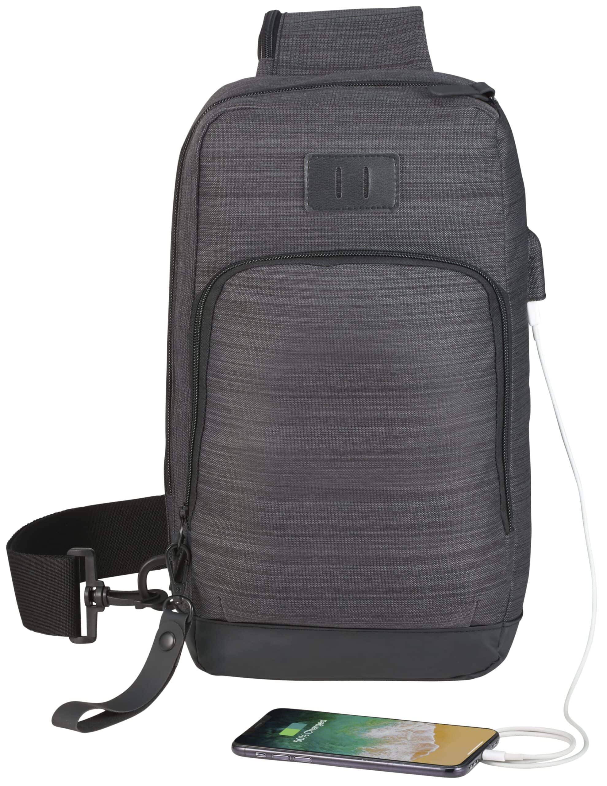NBN stands for ”No Brand Needed.”The NBN Whitby Sling with USB Port includes an internal organizer, an adjustable shoulder strap, and a front zippered pocket that’s big enough for your phone. This PolyCanvas sling includes a side USB port and cable for easy charging on the go. The bag’s oversized zipper pull is perfect for decorating with your logo, providing a unique way to showcase your brand. The NBN Whitby Sling with USB Port has a premium vinyl lash-tab and comes with custom, printed lining. 3.50″ D x 7.50″ W x 14.00″ H